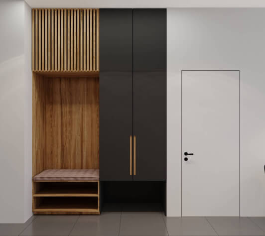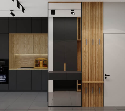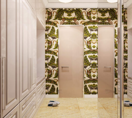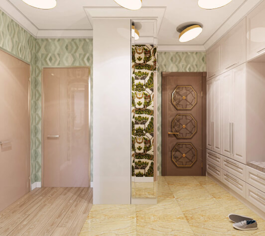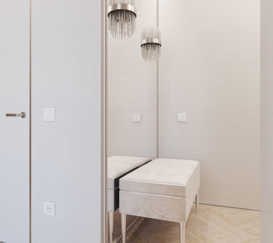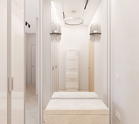 Заказчику в интерьере хотелось ощущения роскоши, богатства. Светлое помещение, уют. Чтобы пространство было максимально функциональным, мы скрыли вместительные системы хранения, это был важный критерий, которого мы придерживались, поскольку было много мужской обуви и других вещей для большой семьи