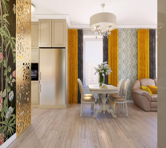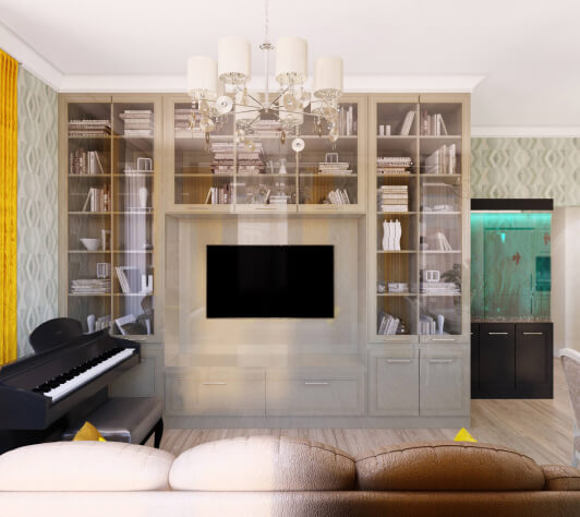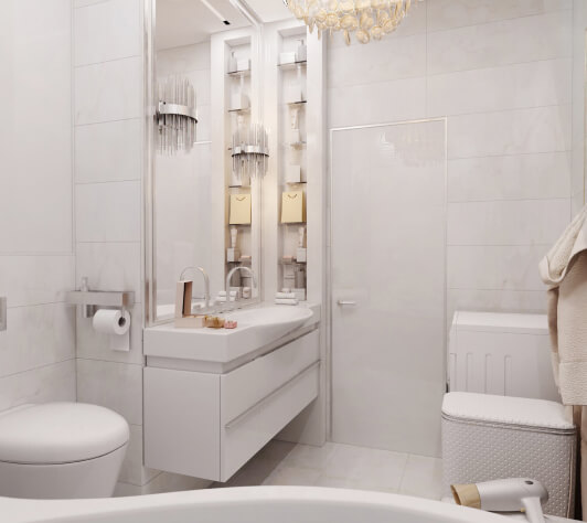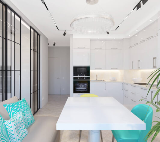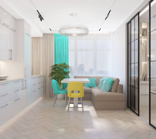 Клиент просил сделать интерьер стильным, наполненным, с интересными деталями, при этом должно было быть светло и воздушно и присутствовать яркие элементы. Стиль мы описали как современный, минимализм. По цветам выполнили все согласно пожеланиям клиента — светло-серый, в сочетании со светлыми цветами, с яркими акцентами