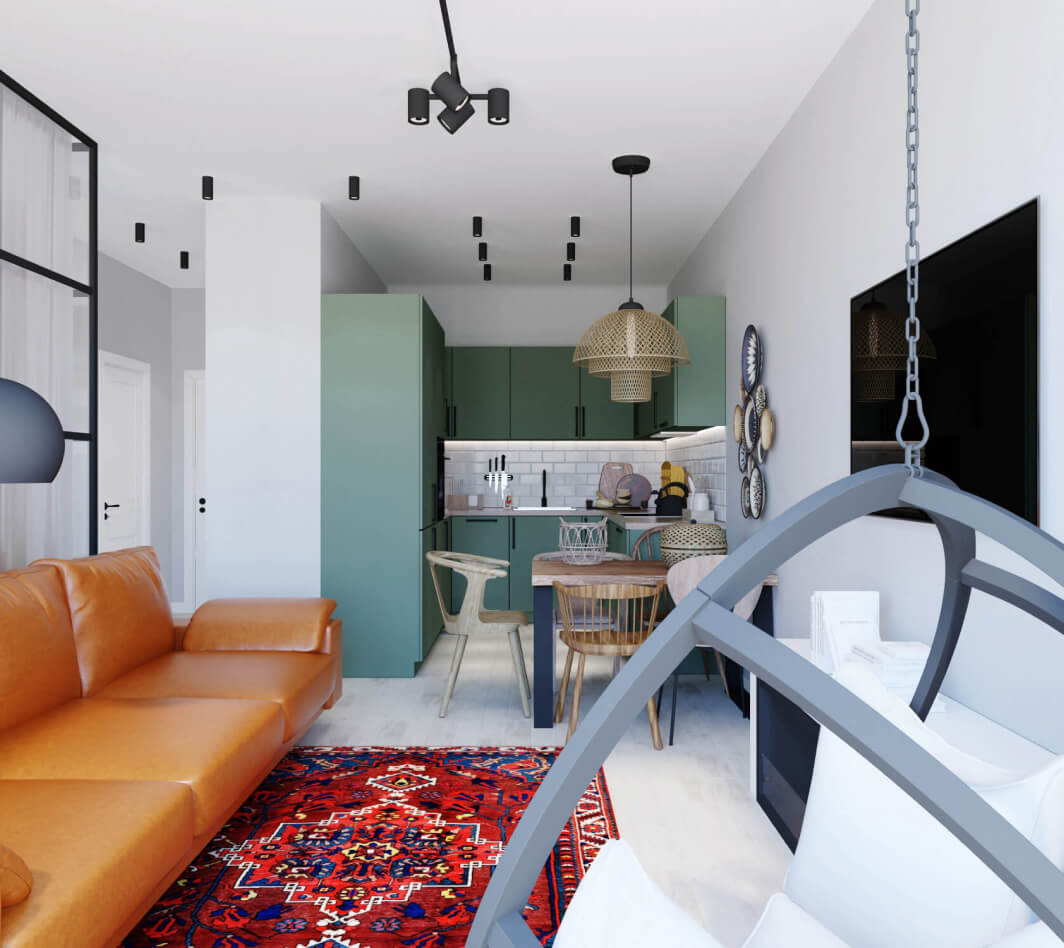 В двухкомнатной квартире 49 кв.м проживает семья из трех человек: молодая пара и их сын-первоклассник. Основной задачей дизайнеров, работающих над этим проектом, было организовать в небольшой двухкомнатной квартире зону отдыха для всей семьи, отдельную комнату для ребенка и спальню для родителей