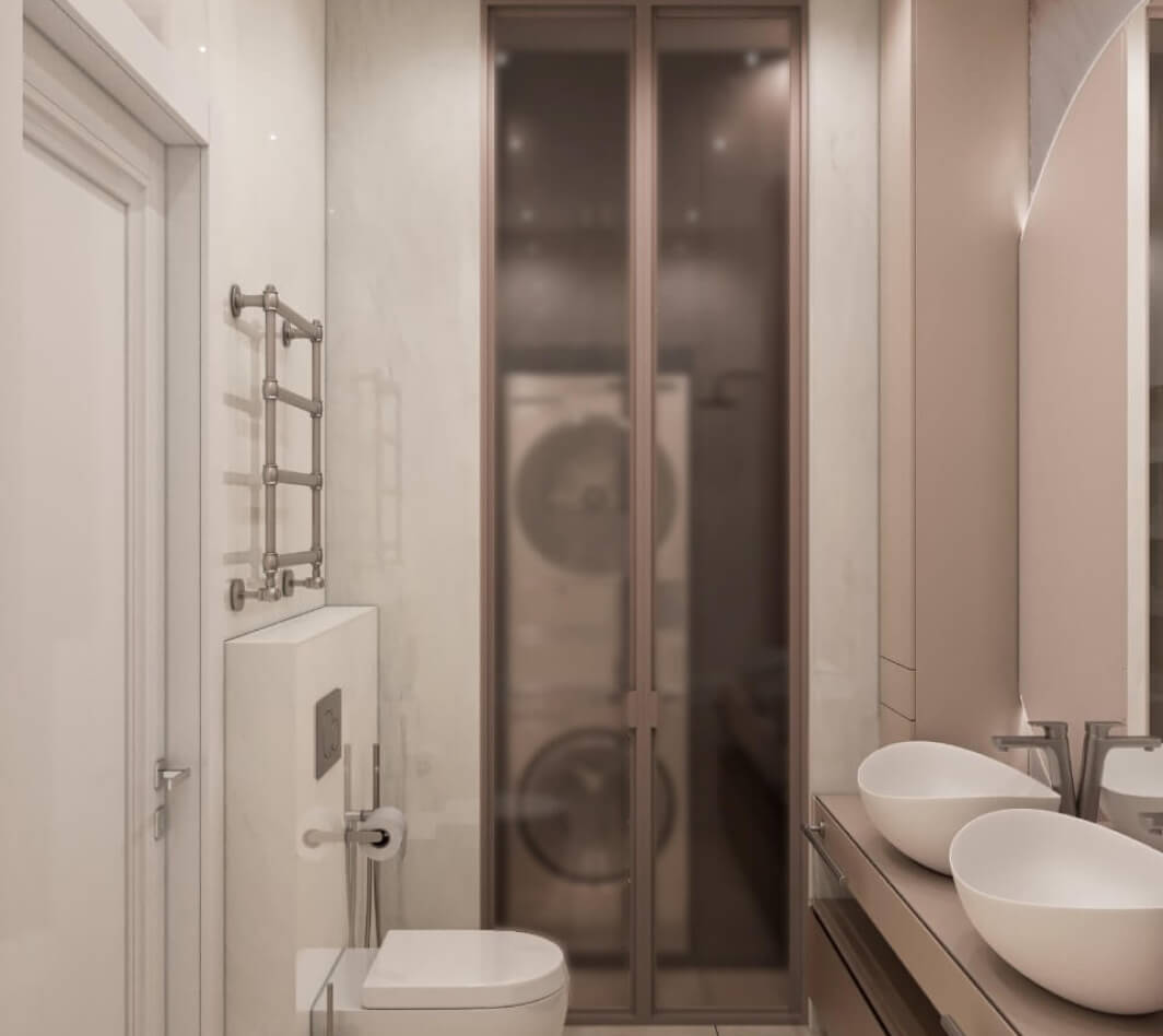 Пространство смело переосмыслено с использованием сдержанных, но ярких контрастных цветов. Слияние стилей, сочетание традиционных классических и современных элементов, контрасты и гармония — вот те приемы, которые позволили замаскировать технические узлы и создать в интерьере уютную и очаровательную атмосферу