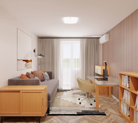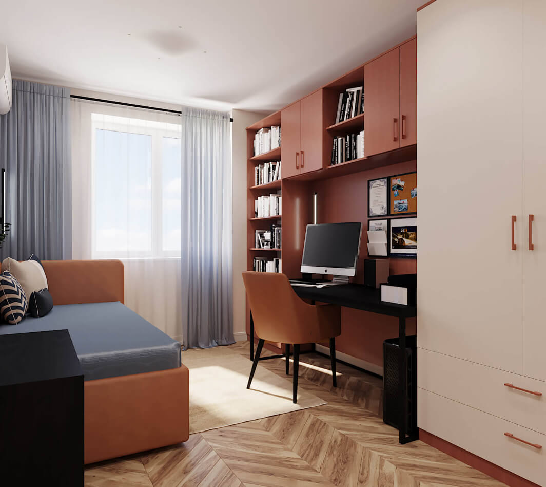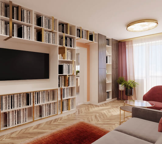 Если вы давно мечтали о красивом и уютном жилье, то эта работа вам будет особенно интересна. Мягкие и нежные тёплые оттенки успокаивают и создают легкую атмосферу. Общий стиль интерьера создаёт гармоничное и уютное настроение