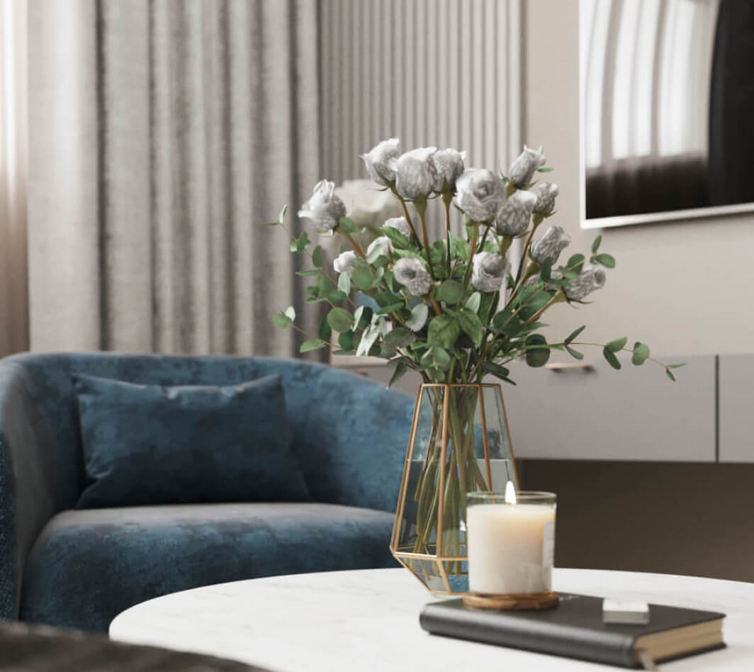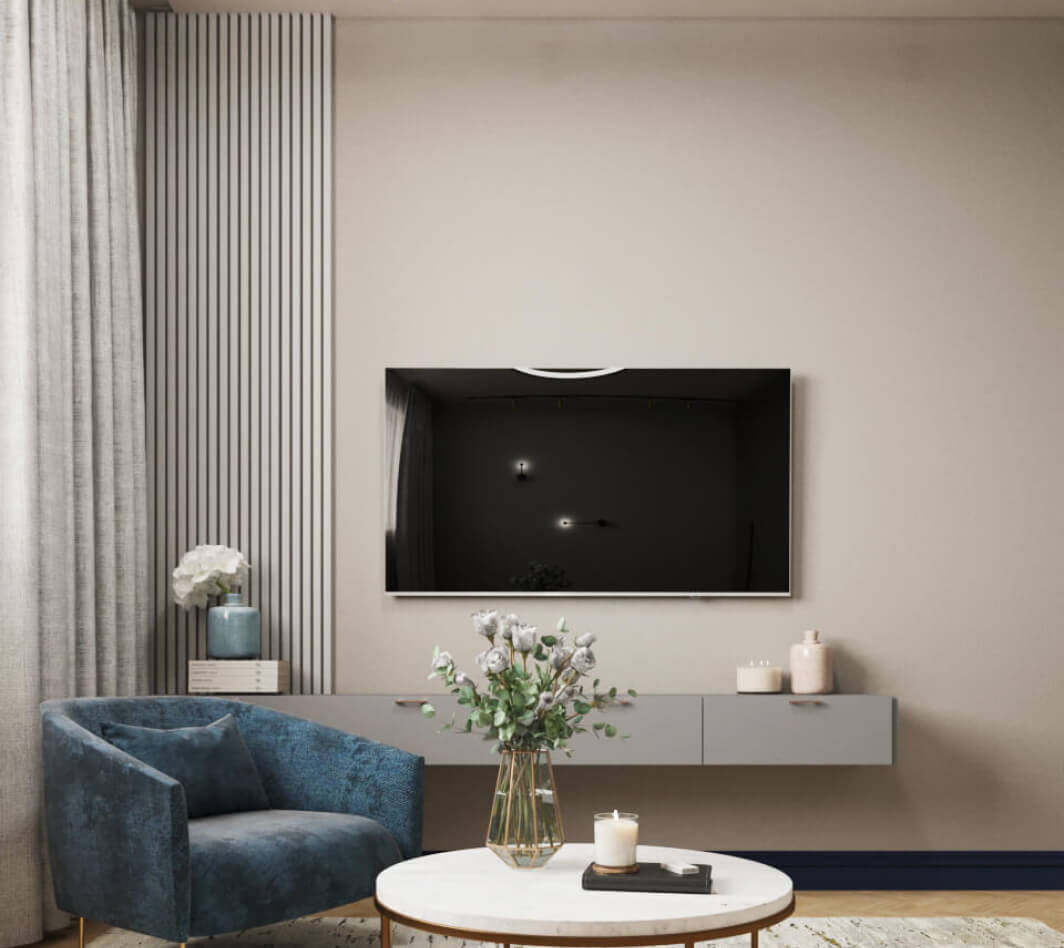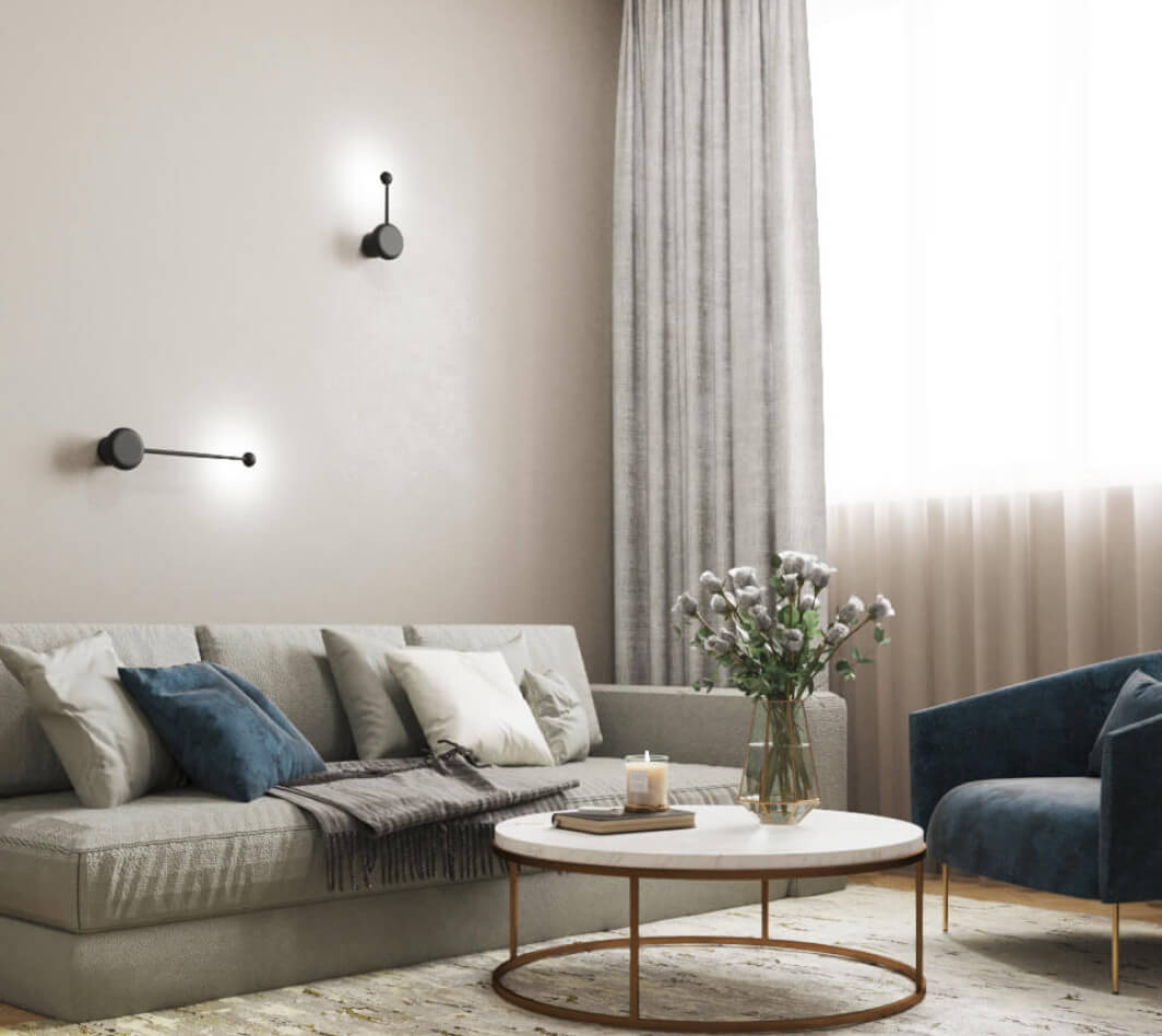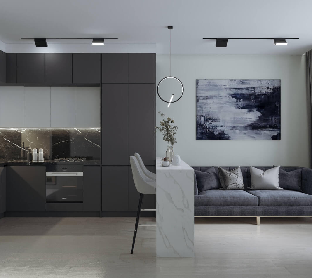 Дизайн квартиры выполнен в современном стиле с элементами минимализма. В отделке преимущественно используются светлые тона – нежно синий и бежевый, акцентом выступают деревянные и мраморные вставки