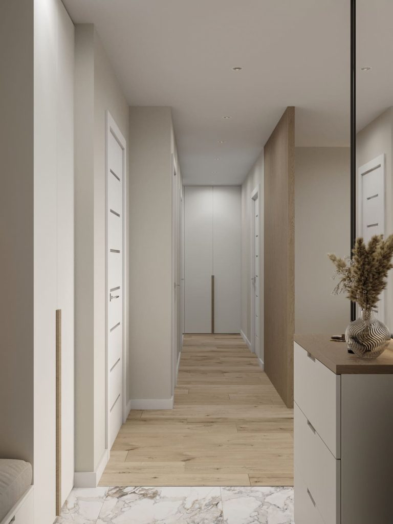 В прихожей светлые стены, тёплое дерево и лаконичные белые фасады создают ощущение простора и чистоты. Вместо громоздких шкафов — полноценная гардеробная, встроенная в нишу, что позволило освободить коридор и сделать его визуально легче.
