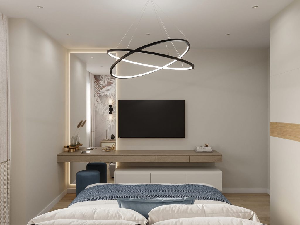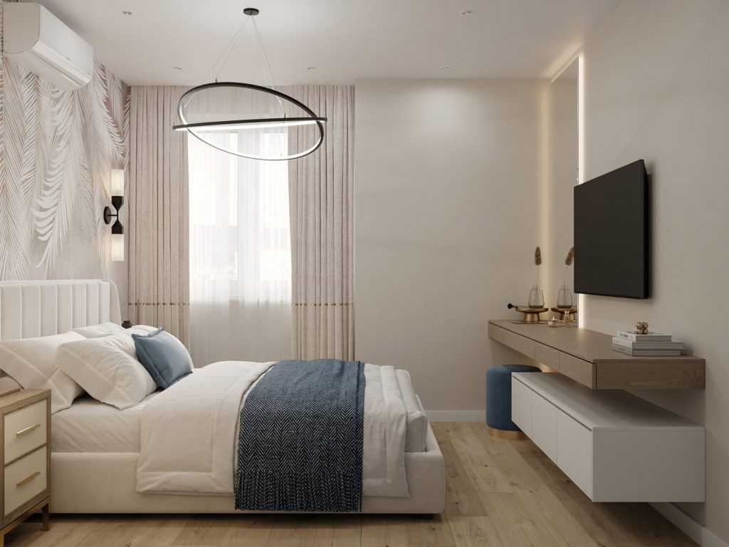 Спальню оформили в светлой бежевой гамме с природными акцентами. Стена за изголовьем украшена обоями с крупным растительным орнаментом — это добавляет объёма и лёгкости. Мягкая кровать с высоким изголовьем и текстиль в спокойных тонах создают атмосферу уюта. По бокам — функциональные тумбы с тёплой подсветкой и строгими бра. Встроенный шкаф с лаконичными фасадами не перегружает пространство, а зона с консолью и ТВ визуально облегчена за счёт подсветки и подвесной конструкции. Синий плед и пуф перекликаются с акцентным цветом во всей квартире, объединяя интерьер в единую стильную композицию.