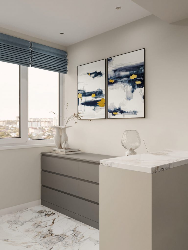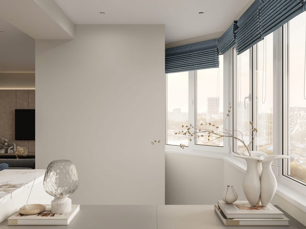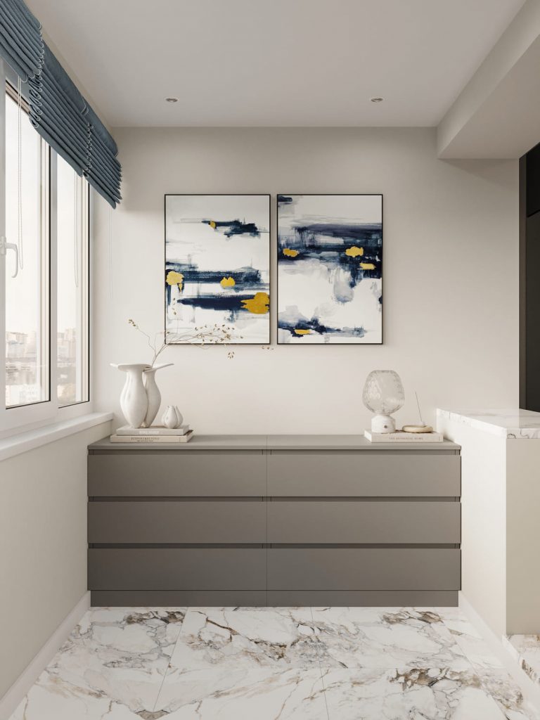 Балкон стал естественным продолжением кухни-гостиной. Здесь мы сохранили ту же отделку пола и цветовую палитру, добавив немного арт-настроения — за счёт современных картин и синей римской шторы. Комод используется для хранения, а декоративные детали делают пространство уютным. За счёт панорамных окон и светлых стен эта небольшая зона получилась очень воздушной и идеальной для утреннего кофе, чтения или просто отдыха у окна.