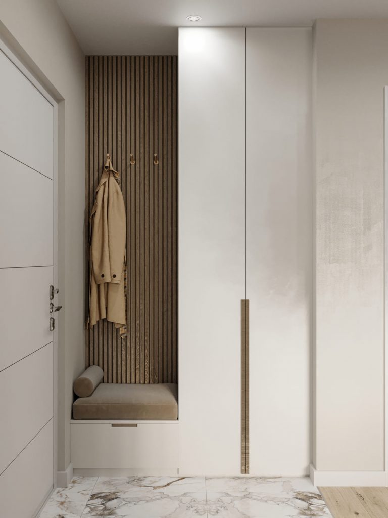 Мы добавили мягкое сиденье для переобувания и вертикальные деревянные рейки — они задают ритм и добавляют уюта. Плитка у входа плавно переходит в тёплый деревянный пол, а точечные светильники равномерно освещают всё пространство.
