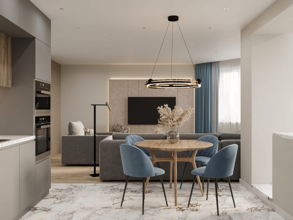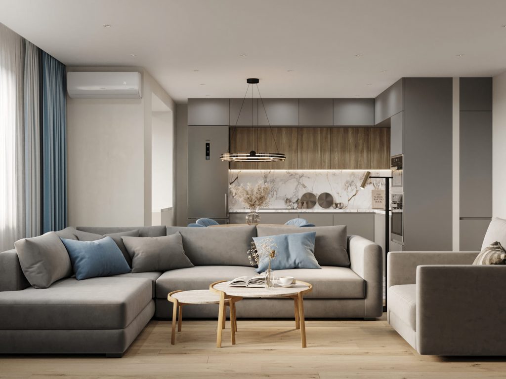 Интерьер этой трёхкомнатной квартиры мы создавали для семьи с двумя детьми — с учётом их повседневных потребностей, привычек и желания проводить больше времени вместе. Пространство выполнено в современном стиле с преобладанием светлых оттенков серого и бежевого, дополненных акцентным синим. Он мягко расставляет цветовые акценты и связывает все помещения в единую композицию.