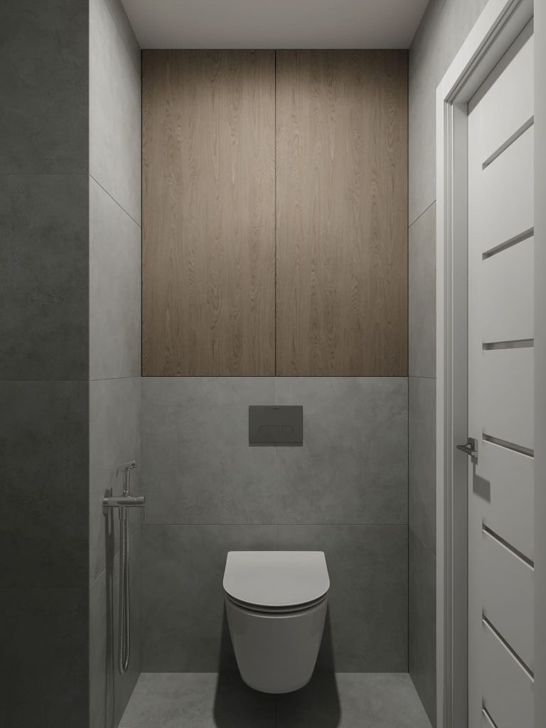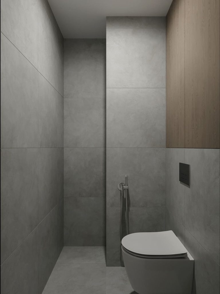 Сочетание плитки под бетон и дерева создаёт современный и спокойный образ. Инсталляция и гигиенический душ — всё на своих местах, без визуального шума. Для хранения над инсталляцией встроен скрытый шкаф с деревянными фасадами в тон отделки. Благодаря минимализму и ровной геометрии пространство выглядит аккуратно и опрятно, несмотря на небольшие размеры.