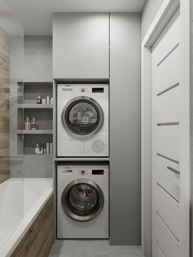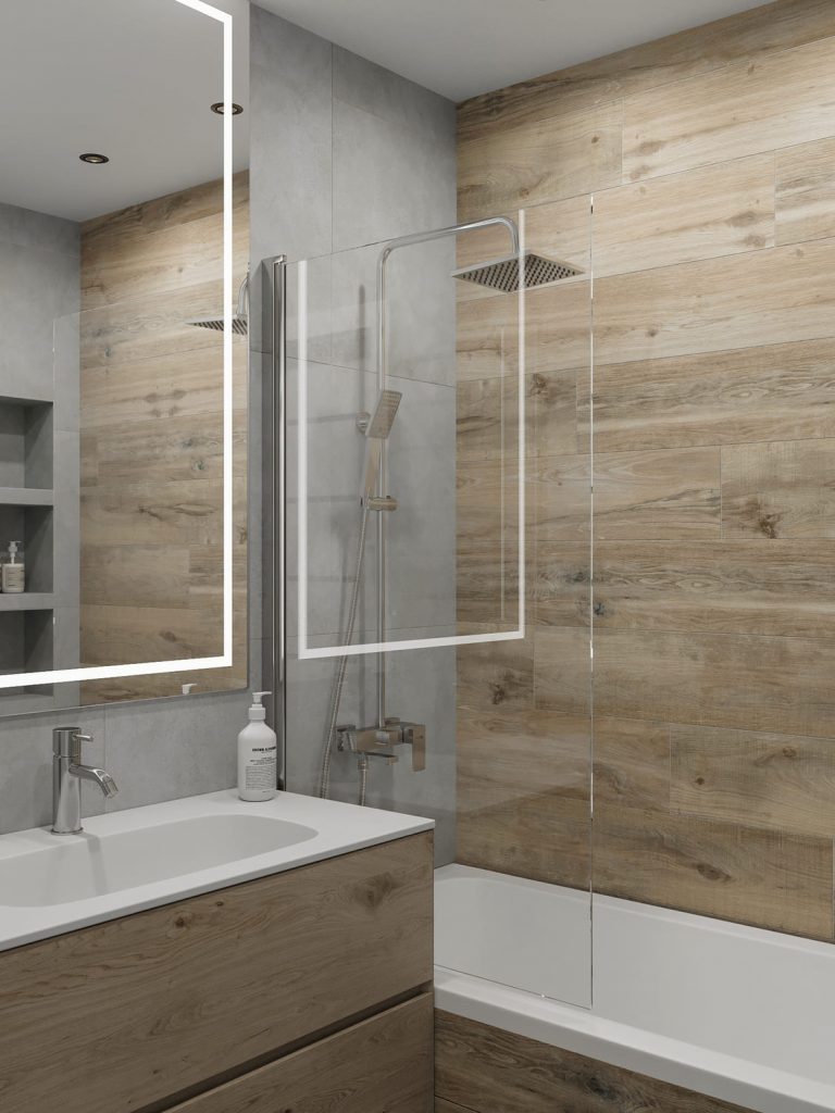 Мы разместили ванну с душевой зоной, вместительный шкаф для бытовой химии и стирально-сушильную технику в колонне. Всё скрыто за фасадами — чисто, аккуратно, удобно. Для отделки использовали сочетание плитки «под дерево» и серого камня — тепло и современно. Зеркало с подсветкой визуально расширяет помещение и даёт комфортный свет для утренних сборов. В нишах над ванной — всё необходимое под рукой, без лишних деталей.