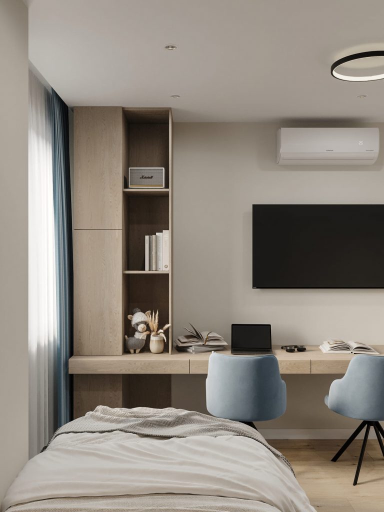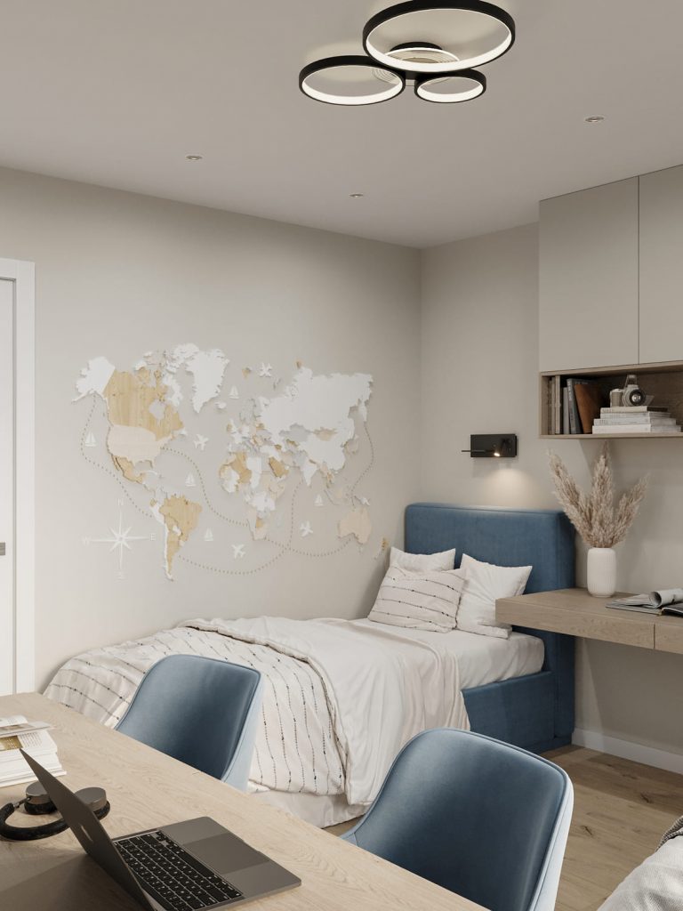 В этой комнате живут двое детей, и задача была — организовать пространство так, чтобы каждому было комфортно. Поставили две отдельные кровати с мягкими изголовьями и встроенным светом для чтения. Между ними — рабочая зона с подвесным столом и закрытыми шкафами сверху для хранения. Акцент сделали на синий цвет в деталях — он добавляет свежести, но не перегружает. Стена с картой мира не только украшает комнату, но и развивает интерес к путешествиям. У окна разместили вторую рабочую зону — с местом под книги и ноутбуки, чтобы дети могли учиться рядом, но не мешая друг другу.