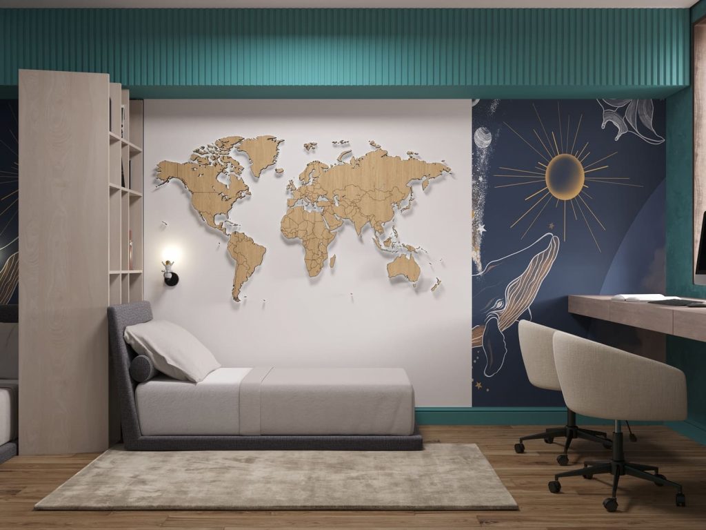 Интерьер с первых минут вдохновляет на открытие мира: на одной стене — яркая карта планеты, на другой — звёзды, планеты, киты и галактики, нарисованные в виде сказочного панно. Всё пространство буквально дышит воображением и жаждой исследовать.