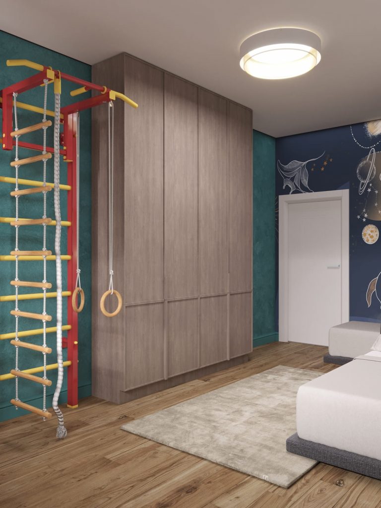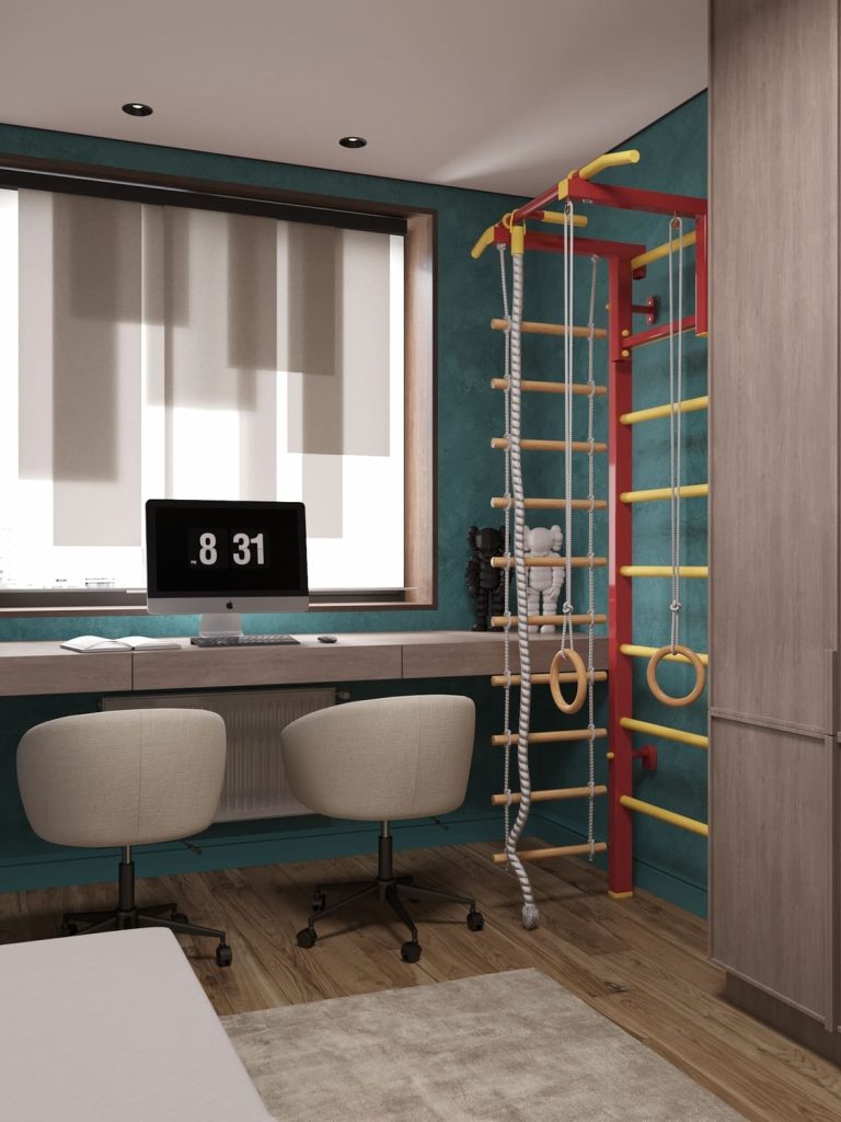 Комната поделена на несколько функциональных зон: Зона сна — две уютные кровати с мягкими изголовьями, разделённые стеллажом, создают ощущение уединения. Зона учёбы — вдоль окна размещена длинная столешница с двумя удобными креслами и естественным светом для продуктивных занятий. Зона активности — спортивный уголок с канатом, турником и кольцами встроен в пространство, не загромождая его, но позволяя тратить энергию с пользой.