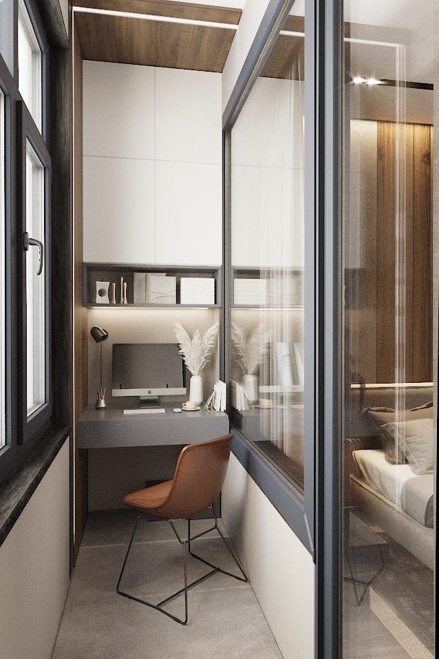 Несмотря на компактные размеры, здесь удалось создать полноценный мини-офис: лаконичная навесная столешница, удобное кресло и аккуратно встроенные полки формируют эргономичную рабочую зону, где всё под рукой и ничего не отвлекает.