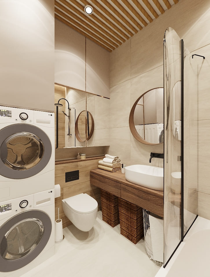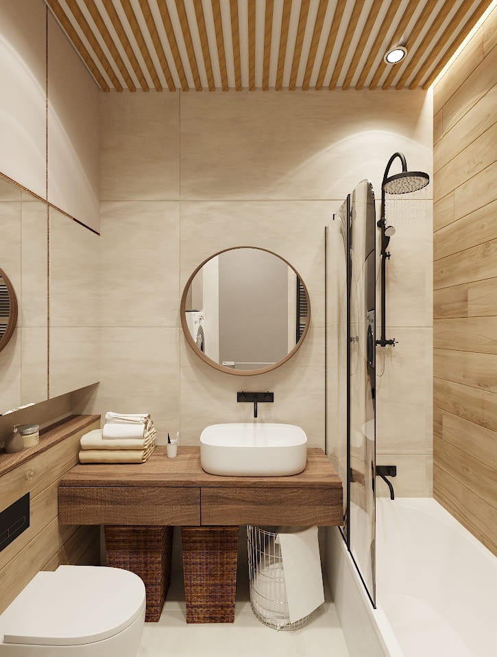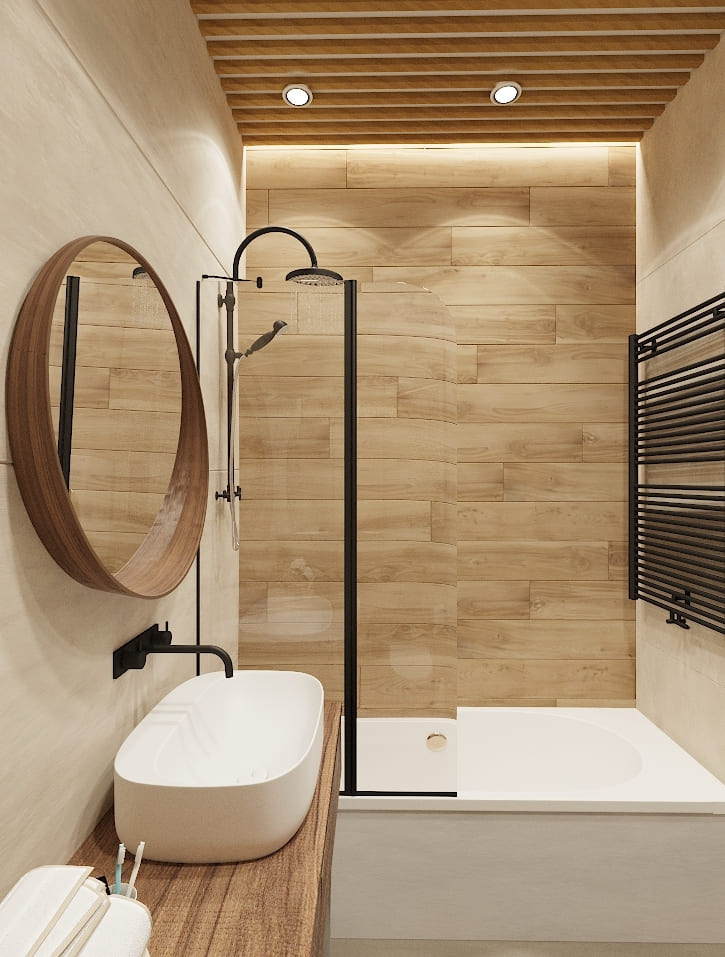 Основой интерьера стали светлая плитка и панели под тёплое дерево. Деревянная столешница с подвесной раковиной и круглое зеркало в тон повторяют природный акцент и делают композицию визуально мягкой и естественной.