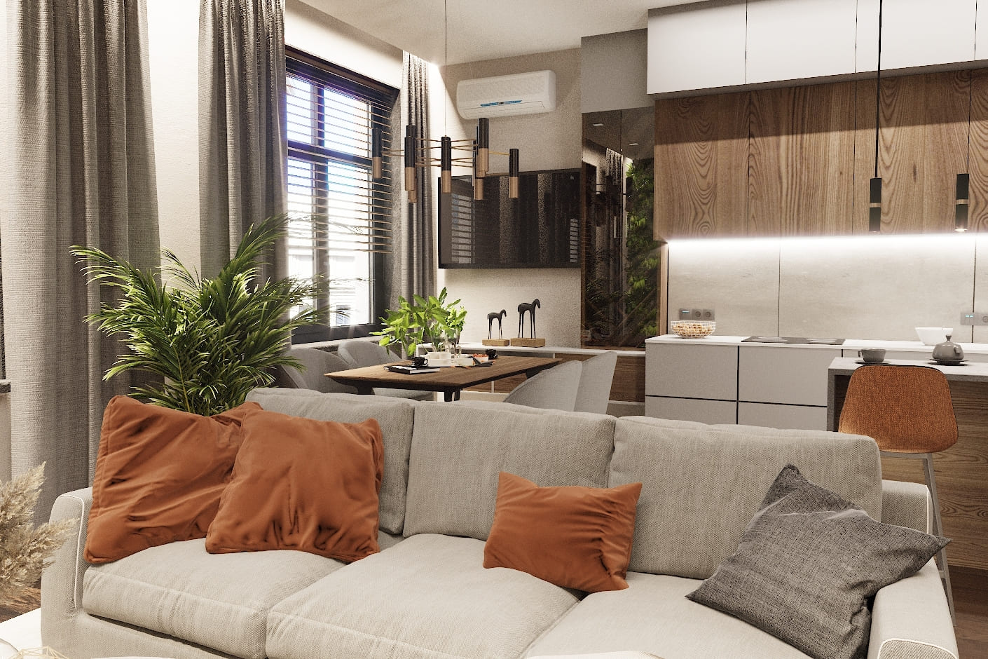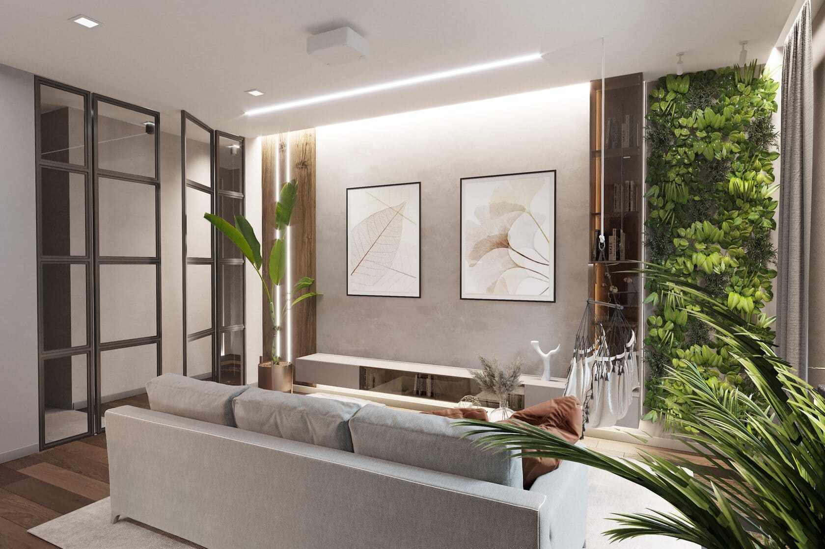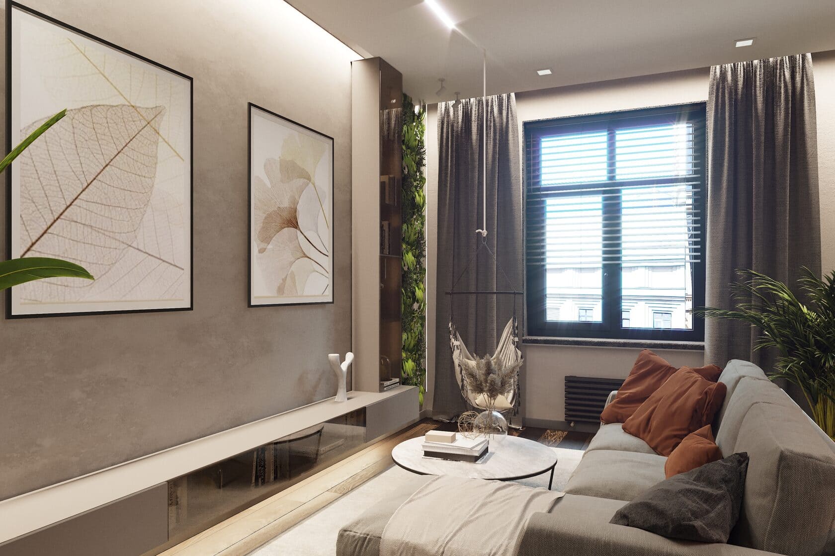 В зоне гостиной расположен большой светлый диван с акцентными терракотовыми подушками — именно они добавляют ощущение домашнего тепла. Рядом — лёгкий круглый стол и мини-качели у окна, которые в будущем станут любимым местом для чтения и отдыха. Живые растения и вертикальная зелёная стена добавляют пространству свежести и создают ощущение домашнего оазиса.