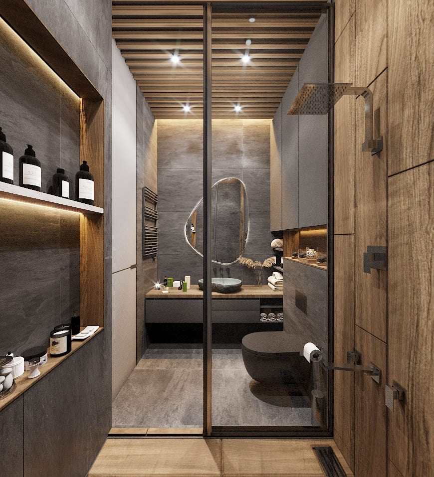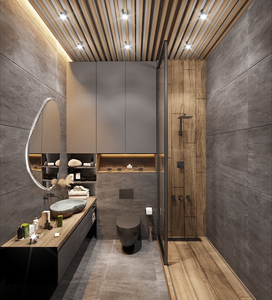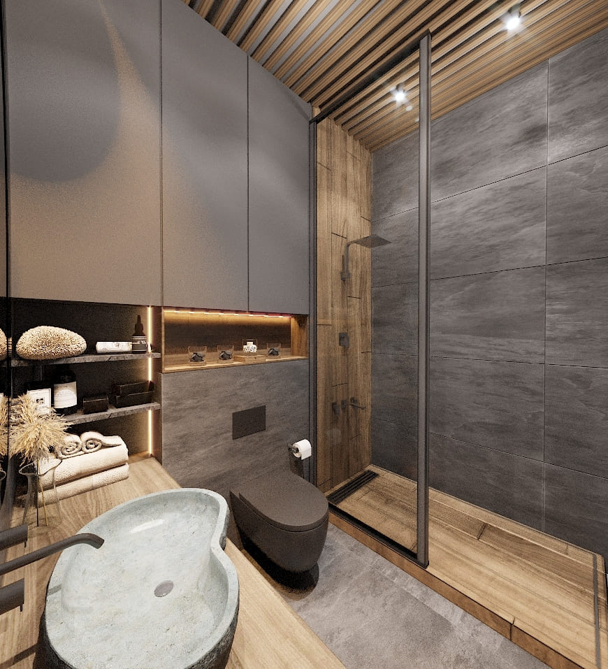 Основой интерьера стали крупноформатные тёмно-серые плиты, создающие эффект каменной поверхности. На их фоне особенно красиво смотрится тёплое дерево — оно добавляет пространству уют и балансирует прохладную палитру. Потолок с деревянными рейками визуально вытягивает помещение и связывает его по стилю с мастер-спальней, создавая ощущение единой приватной зоны.