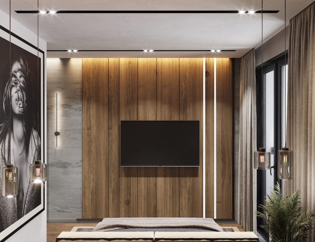 На противоположной стене размещена ТВ-зона, оформленная теми же деревянными панелями и декоративными световыми линиями — это делает интерьер цельным, визуально теплым и сбалансированным.