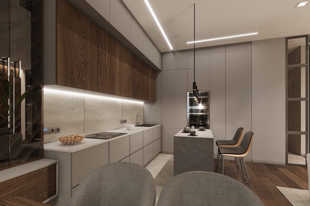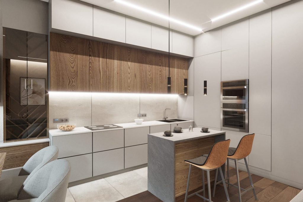 Кухня выполнена в лаконичном современном стиле: верхние фасады — белые, нижние дополнены тёплым деревом, а подсветка подчёркивает глубину текстуры. Небольшой остров служит одновременно рабочей зоной и местом для быстрых завтраков.
