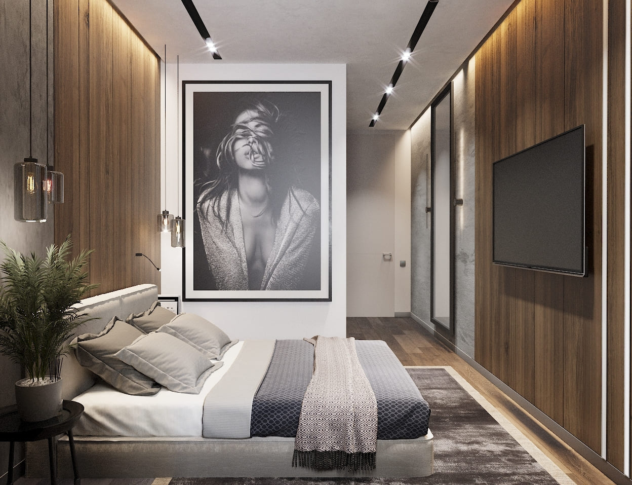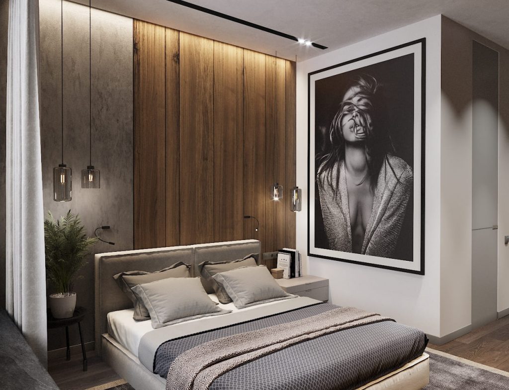 Большой монохромный арт-портрет у изножья кровати добавляет характер, смелость и небольшую долю брутальности — именно то, что и требовалось для приватной зоны взрослых.