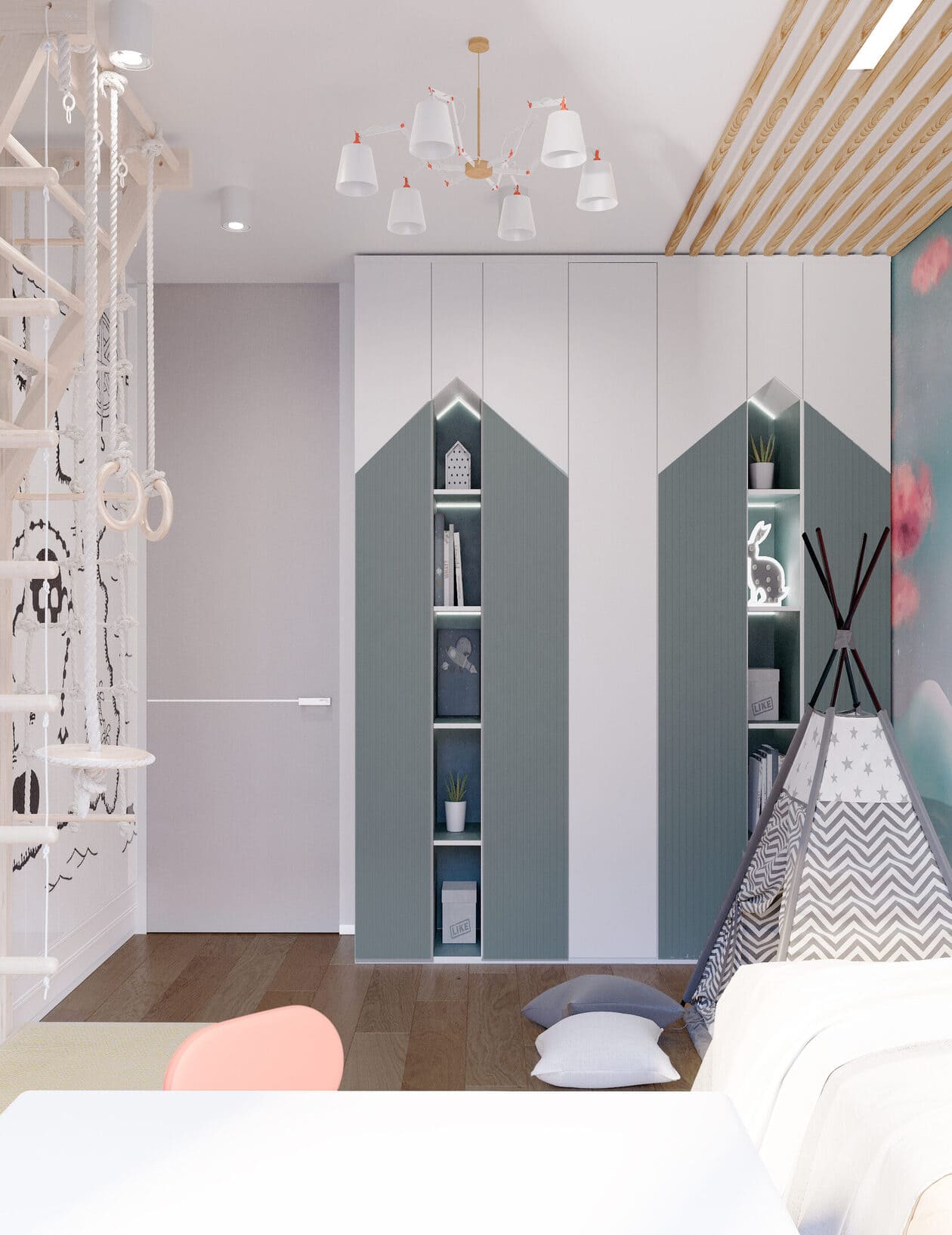 Система хранения выполнена в виде стилизованных шкафов-домиков — это не только удобно, но и создаёт в комнате архитектурную игру, добавляя визуальный интерес и стимулируя фантазию.