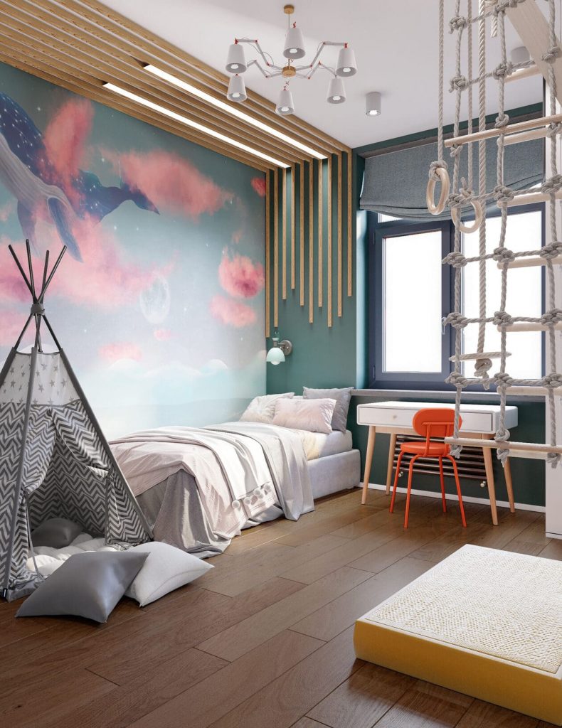 Главным акцентом комнаты стала волшебная стена с изображением косатки, плавающей среди розовых облаков.