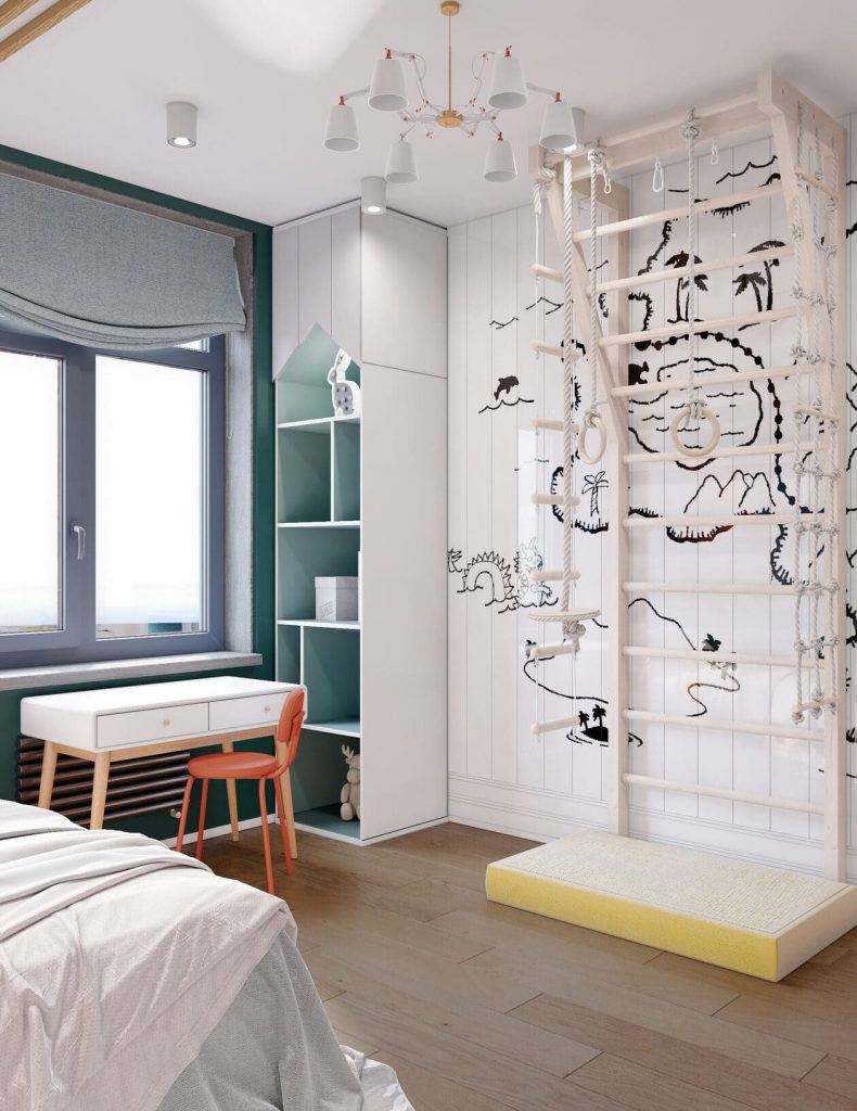В комнате предусмотрено всё для активности и развития: спортивный уголок с деревянными перекладинами, канатами и кольцами станет любимым местом подрастающего ребёнка. Мягкий мат делает даже самые смелые упражнения абсолютно безопасными.