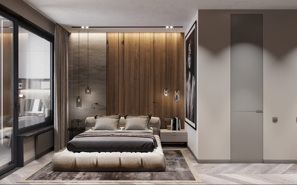 Центром композиции становится высокая мягкая кровать с объёмным изголовьем, на фоне которого — акцентная стена из тёплых деревянных панелей. Мягкая подсветка сверху подчёркивает фактуру древесины и добавляет интерьеру глубины, особенно в вечерних сценариях.
