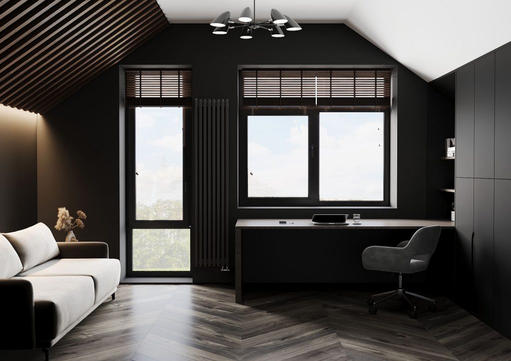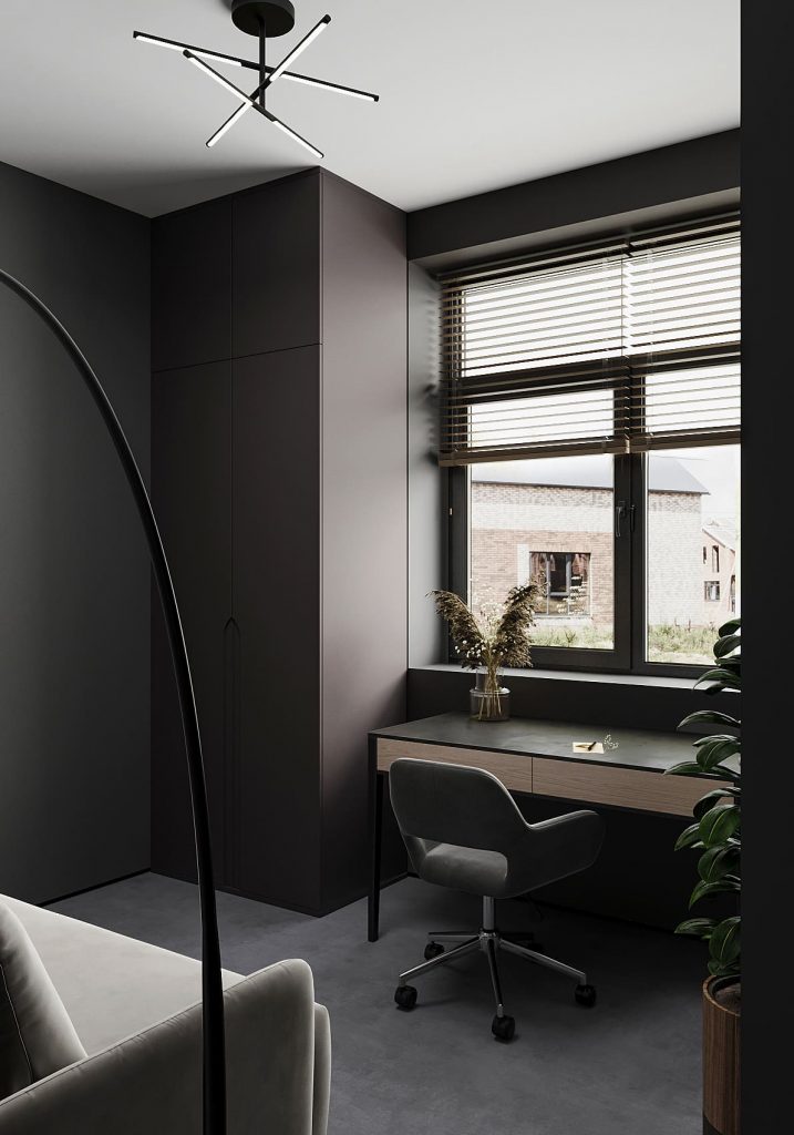 Рабочий стол вытянут вдоль окна, благодаря чему естественный свет освещает рабочую поверхность на протяжении всего дня. Деревянная фактура столешницы добавляет тепла и разбавляет монолитность тёмного интерьера.