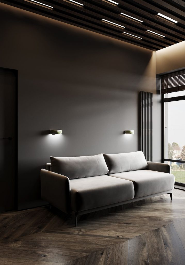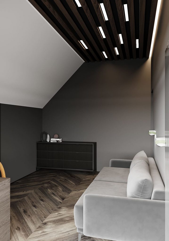 Для отдыха предусмотрен диван, расположенный в уютной нише. Подсветка за ним мягко выделяет геометрию пространства, а потолок с деревянными рейками создаёт архитектурную глубину и поддерживает общий стиль дома.