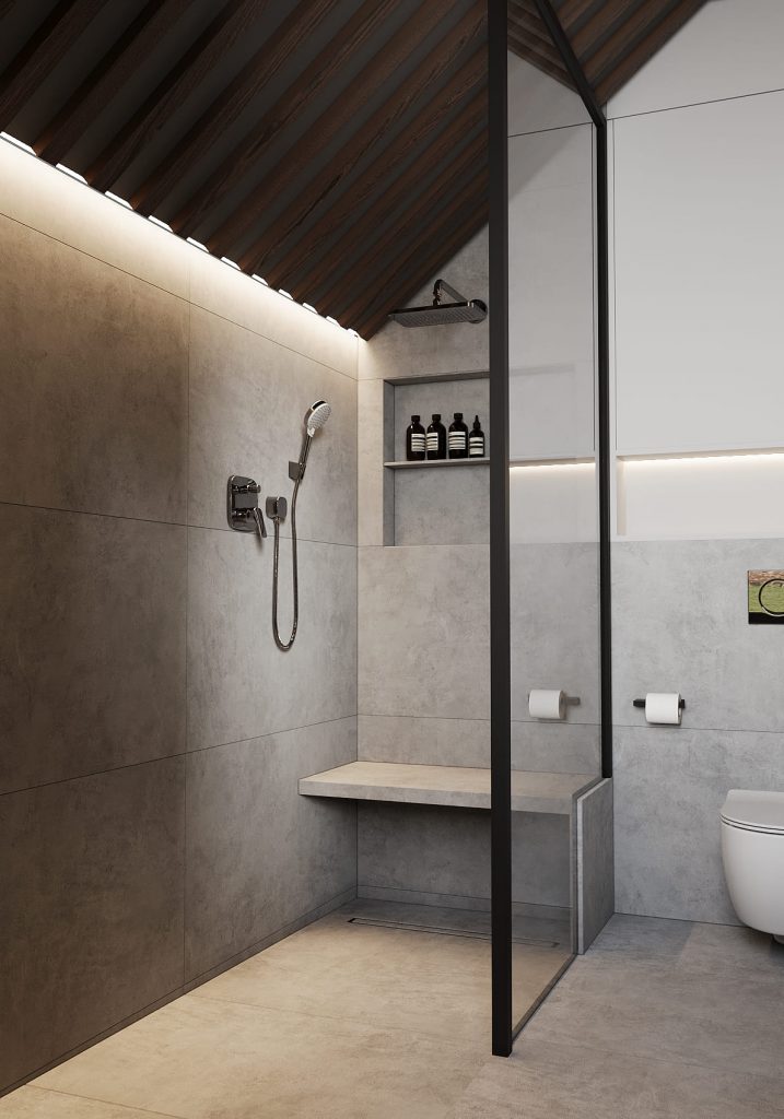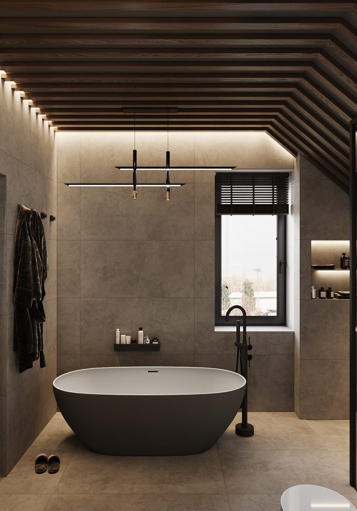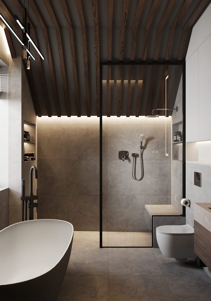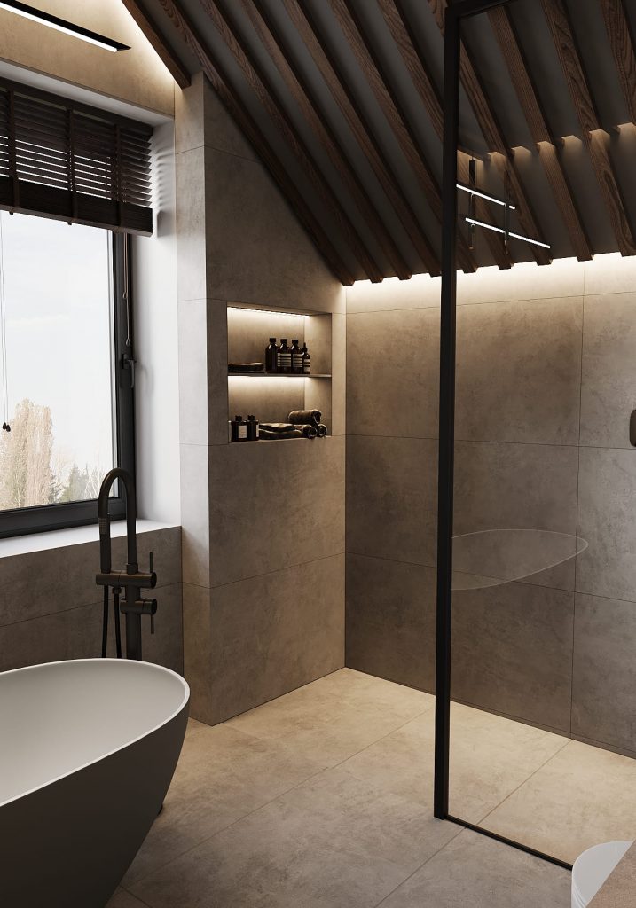 Зона с отдельностоящей ванной выглядит особенно эффектно: тёмный корпус и белоснежная внутренняя поверхность создают контраст, а высокий смеситель подчёркивает минимализм. Напротив — просторная душевая с прозрачной перегородкой и встроенной скамьёй, которая добавляет ощущение спа-салона прямо дома.