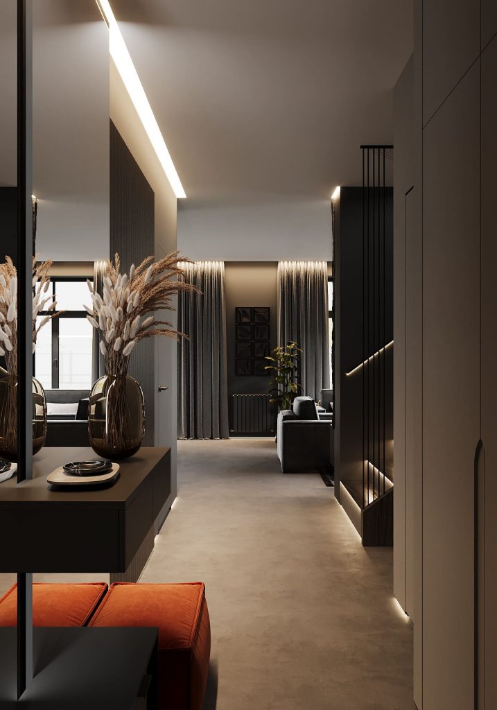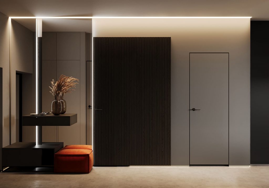 Стены и встроенные шкафы выполнены в единой гамме и будто растворяются друг в друге, создавая ощущение целостного монолита. Чёрные вертикальные рейки лестницы добавляют графичности и строгости, а терракотовый пуф у входа вносит яркий штрих, который сразу оживляет пространство.