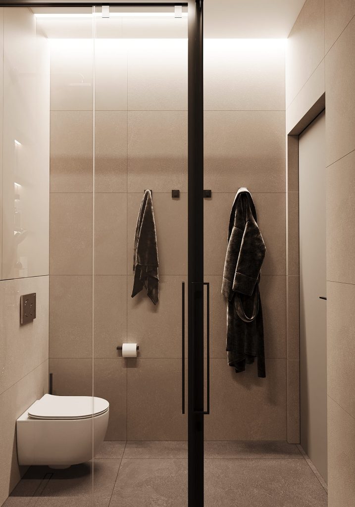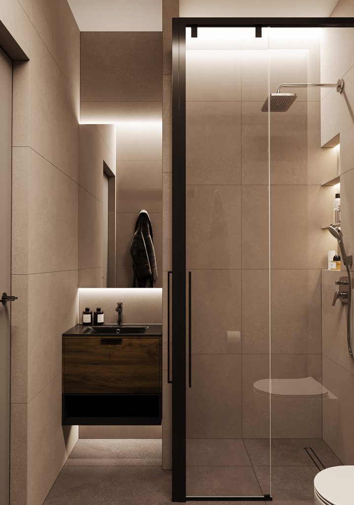 Главное преимущество санузла — отдельная душевая с прозрачной перегородкой и встроенными нишами с подсветкой для хранения косметики.