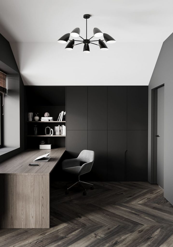 Кабинет хозяина дома получился строгим, графичным и максимально функциональным. Здесь сразу ощущается деловая атмосфера: чёрные стены и встроенные шкафы образуют цельный фон, в который встроено всё необходимое для хранения.