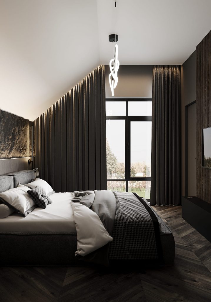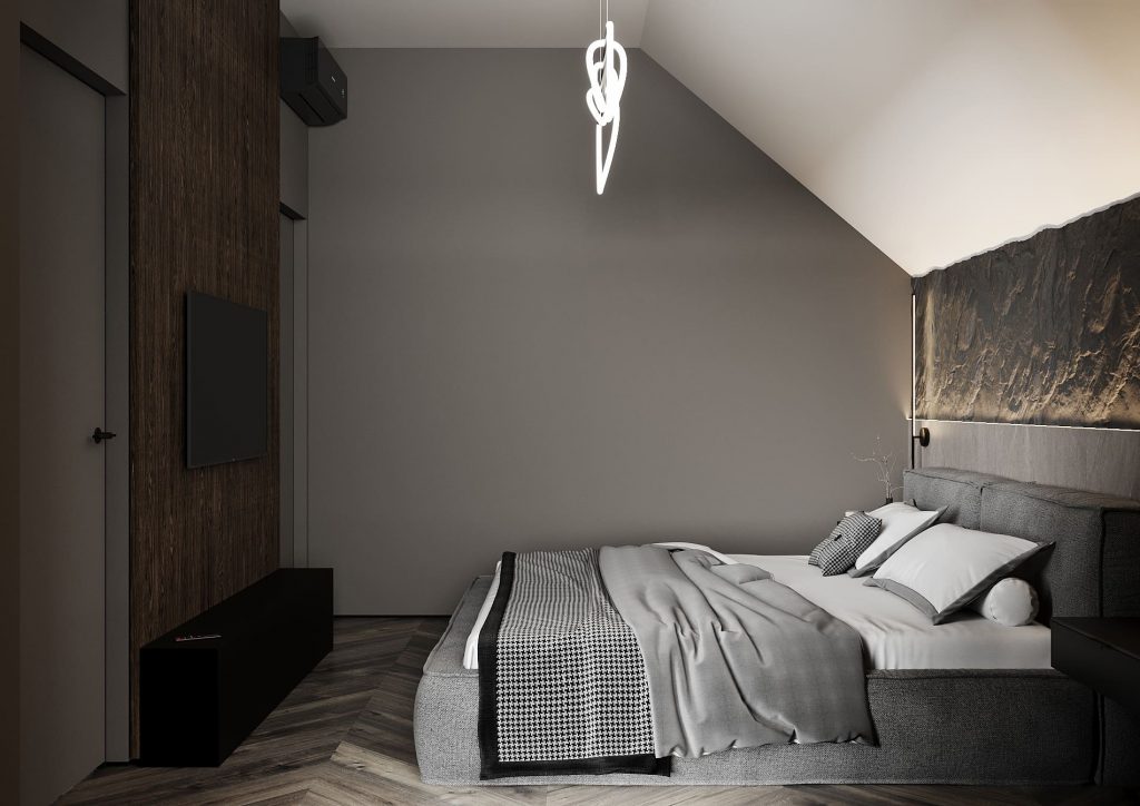 Интересным решением стали подвесные светильники по обе стороны кровати и пластичная люстра над ней — они будто парят в пространстве, задавая лёгкую динамику строгой геометрии. Деревянные панели на стене напротив добавляют тепла и текстуры, а встроенный телевизор делает спальню функциональной.