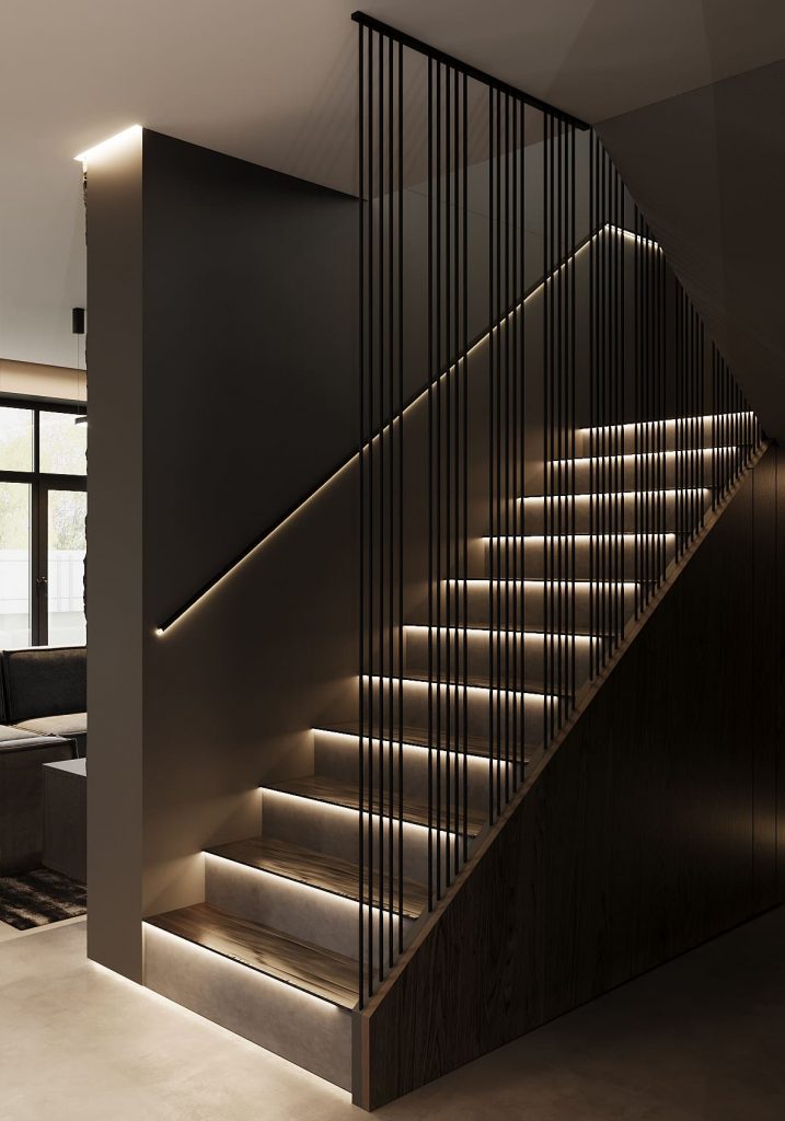 С порога дом задаёт настроение всего интерьера — здесь царит спокойная минималистичная атмосфера с акцентом на мягкий свет и игру фактур. Вместо привычных люстр пространство наполнено подсветкой: световые линии в потолке и у плинтусов создают ощущение парящей архитектуры, а ступени лестницы словно светятся изнутри, превращая подъём наверх в отдельный визуальный акцент.