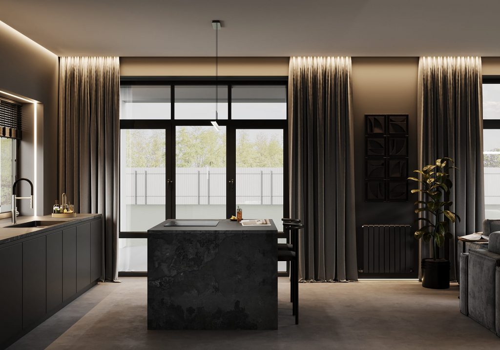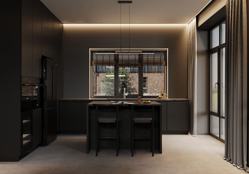 Кухня продолжает общий образ — матовые чёрные фасады, монолитный остров с каменной фактурой и встроенная техника. Центральный остров одновременно выполняет роль рабочей поверхности и барного стола, а скрытые системы хранения поддерживают идеальный порядок.