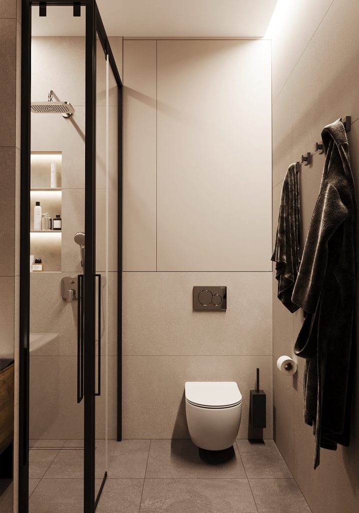 Стены и пол облицованы крупноформатной плиткой спокойного серо-бежевого тона, что визуально расширяет пространство и создаёт ощущение чистоты. Чёрные акценты — смесители, душевая перегородка и аксессуары — добавляют графичности и контрастности.