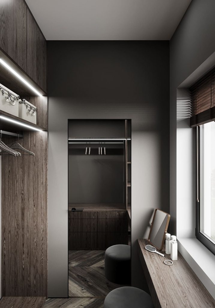 Гардеробная решена в темных древесных оттенках и выдержана в минималистичном стиле. Встроенные шкафы с подсветкой, открытые полки и вместительные системы хранения позволяют удобно организовать одежду и аксессуары. У окна предусмотрена длинная консоль с зеркалом — удобное место для ухода и макияжа. Атмосферу завершает естественный свет из окна и тёплое освещение, подчеркивающее фактуру дерева и создающее ощущение уюта и приватности.