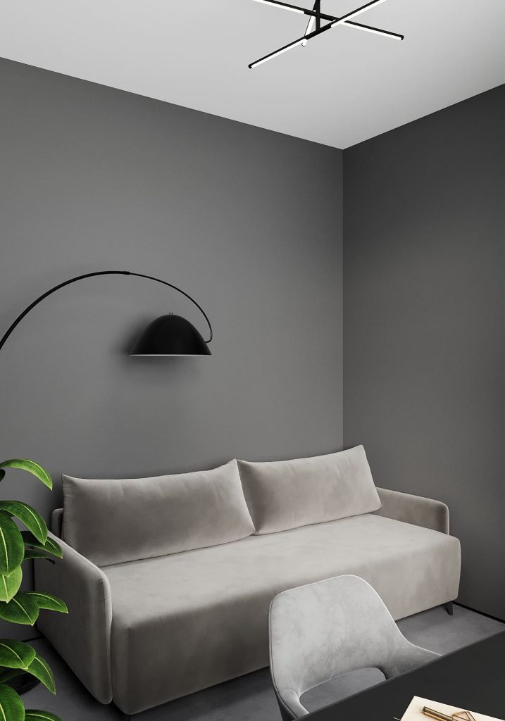 В центре — лаконичный диван-трансформер светлого оттенка, который при необходимости превращается в полноценное спальное место. Его мягкая обивка добавляет уюта и контрастирует с графичными тёмными стенами.