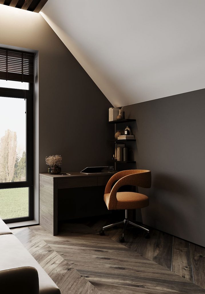 Рабочее место у окна наполнено естественным светом: массивный стол из дерева и лаконичные полки создают спокойную и организованную атмосферу. Акцентным элементом стал стул терракотового оттенка — яркий, но в то же время гармоничный штрих, оживляющий тёмную гамму.