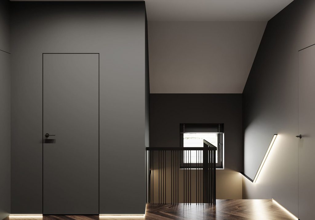 Здесь стены и двери выстроены в единую плоскость: они словно растворяются, оставляя лишь намёк на скрытые комнаты. Такой приём делает пространство максимально чистым и архитектурным. Тёмные оттенки стен подчеркнуты диагональным паркетом из дерева с насыщенной текстурой. Контраст между матовыми поверхностями и живым рисунком пола добавляет глубины. Металлические чёрные рейки ограждения лестницы выступают графическим акцентом, добавляя холлу современную лёгкость и завершённость.