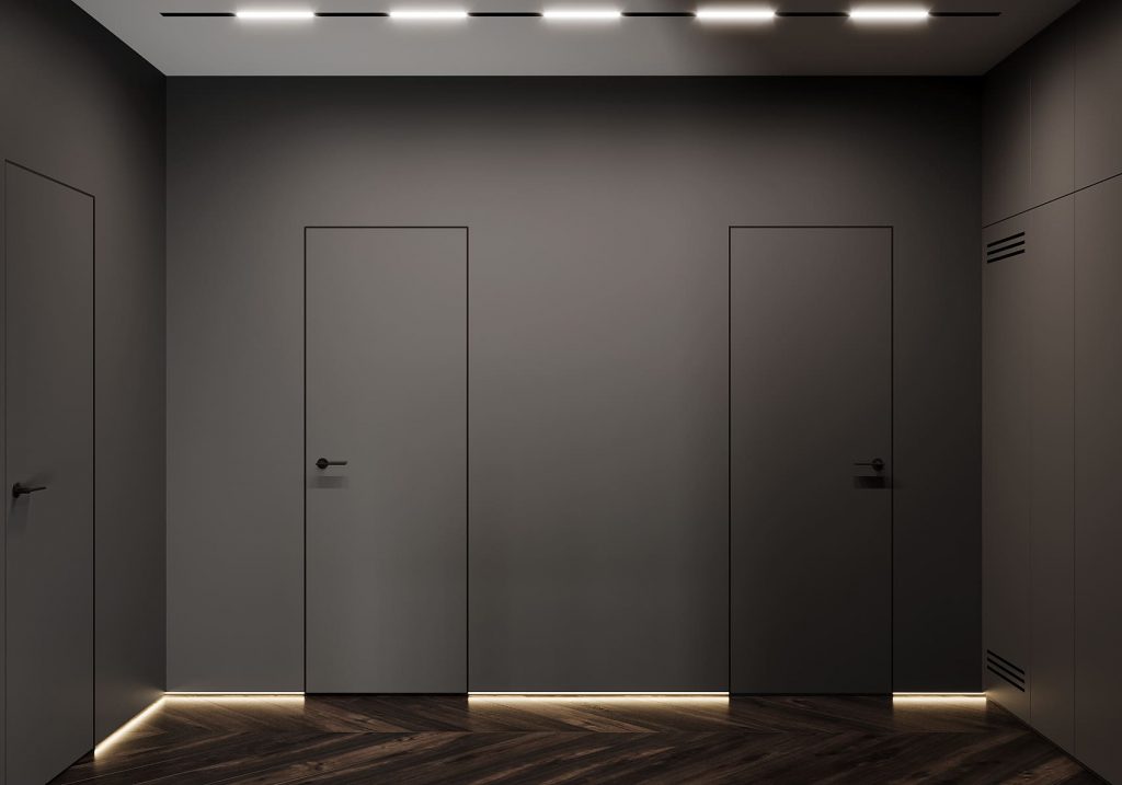 Подсветка вдоль потолка и оконных проёмов создаёт мягкое рассеянное свечение, заменяя традиционные люстры.
