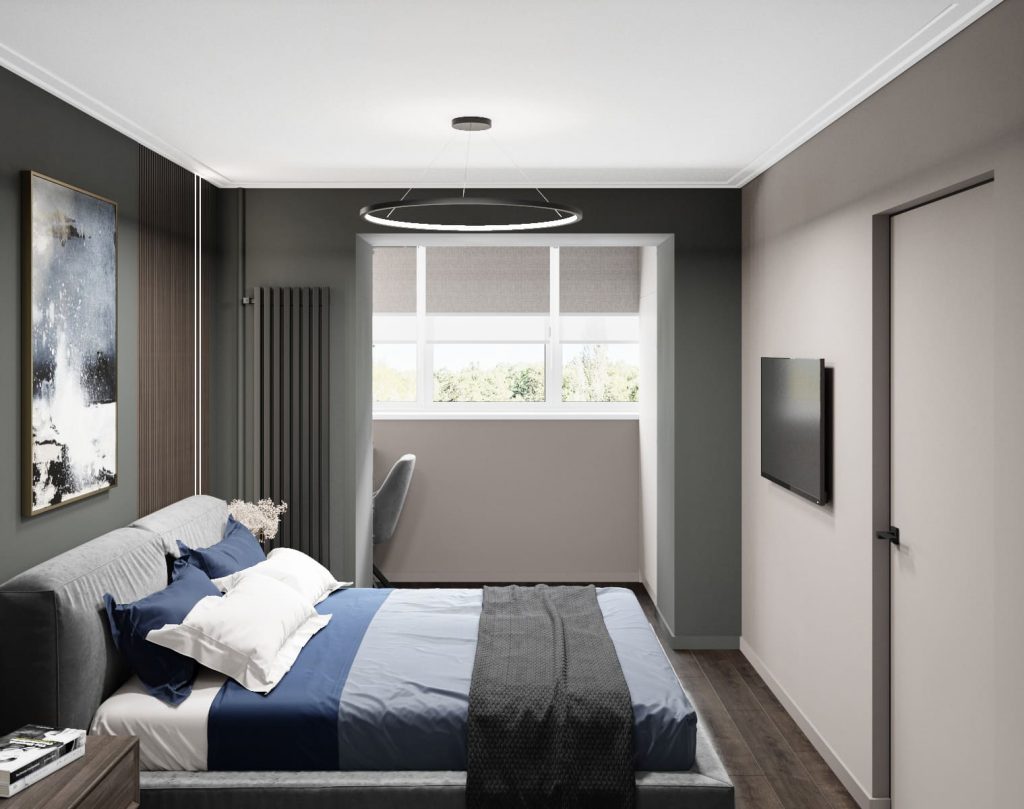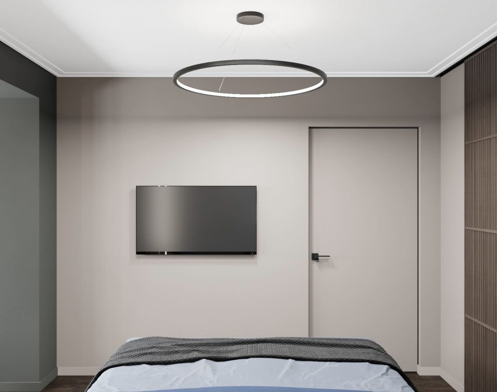 По обе стороны от кровати — подвесные тумбы и вертикальные светильники. В изножье — телевизор и рабочее место у окна, встроенное в нишу. Светильник-кольцо на потолке — лаконичный, но эффектный акцент.