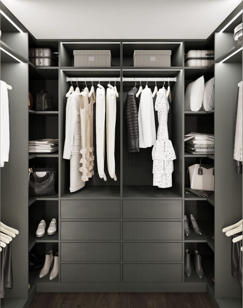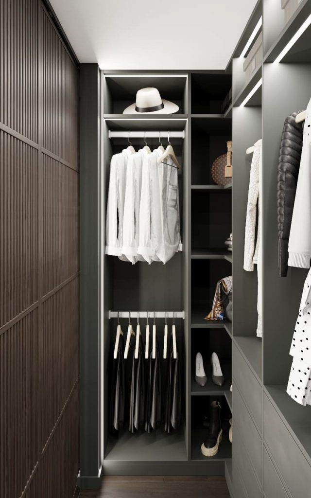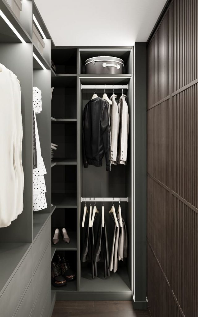 Гардеробная расположена за рейчатой перегородкой в спальне и спроектирована так, чтобы задействовать каждый сантиметр. Открытая система хранения — в матовом тёмно-сером оттенке, с продуманным разделением по зонам: два уровня для одежды на плечиках, выдвижные ящики, полки для обуви, сумок и коробок. Освещение встроено в конструкцию — ничего лишнего, только чистая геометрия и порядок. Всё под рукой, ничего не бросается в глаза.