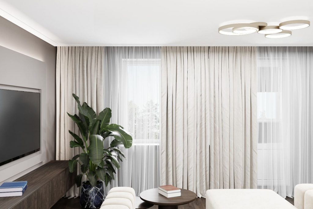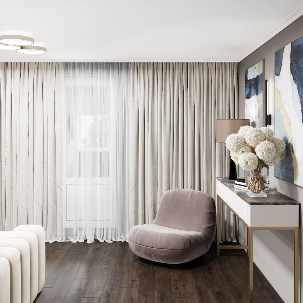 Окна оформлены в два слоя: плотные шторы и тюль, что позволяет регулировать свет. На полу — тёплый ламинат, сочетающийся с деревянными элементами и текстилем. Общая гамма — светлая, спокойная, с акцентами в отделке и декоре.