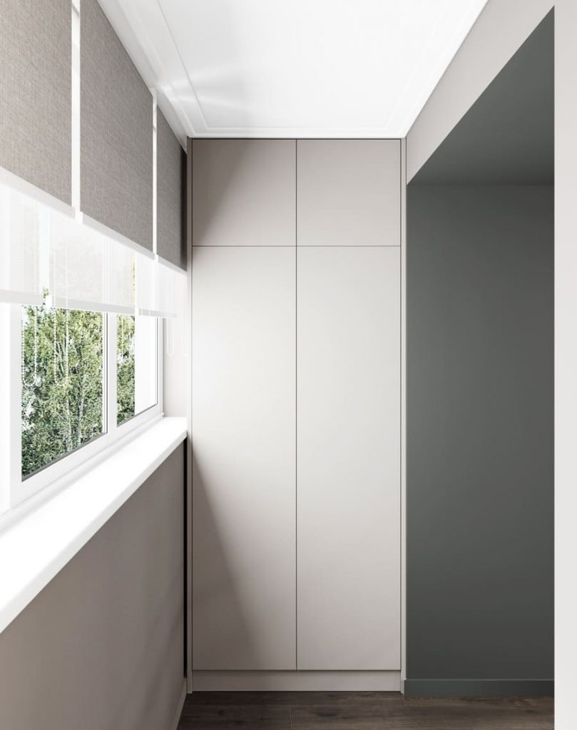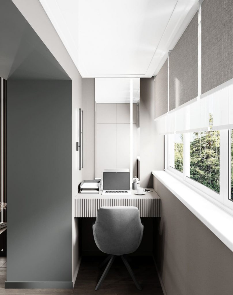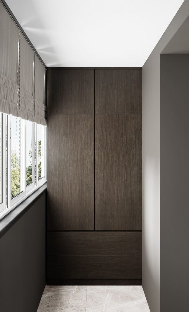 Обе лоджии включены в общее пространство квартиры, но каждая выполняет свою задачу. Лоджия у спальни превратилась в полноценное рабочее место: компактный стол с вертикальными рёбрами, удобное кресло, встроенное зеркало и спокойная гамма — всё для концентрации и уюта. Лоджия у гостиной — скорее вспомогательная. Здесь расположены встроенные шкафы под хранение, оформленные в тон остального интерьера. Свет — приглушённый, с акцентными бра на стене.