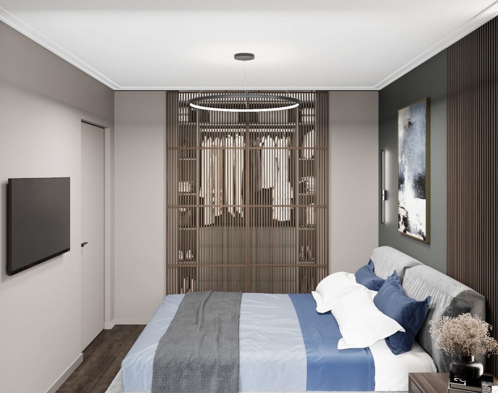 Вместо классического шкафа — зонированная гардеробная с перегородкой из деревянных реек. Решение позволило сохранить лёгкость пространства и удобно организовать хранение.