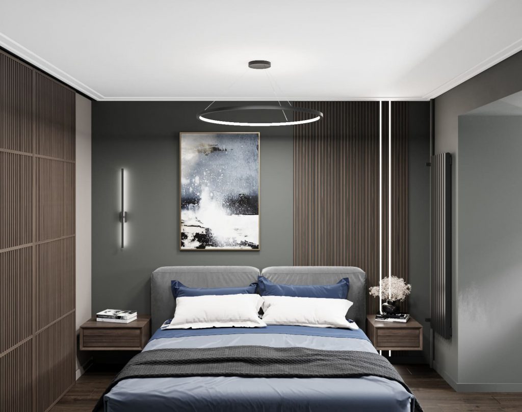 Интерьер спальни построен на балансе тёмного и светлого. Глубокий серо-зелёный цвет стены и тёплые деревянные рейки создают выразительный фон для мягкого серого изголовья. Постель в холодной сине-серой гамме добавляет контраста и визуальной глубины.