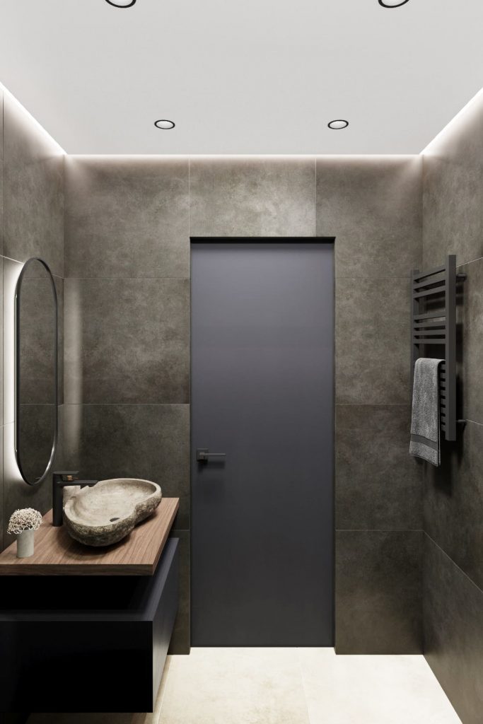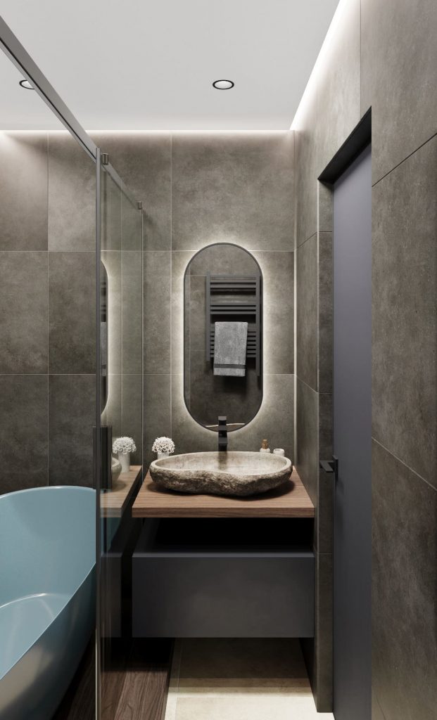 Отделка стен — крупноформатный тёмный керамогранит, создающий глубину и атмосферу спа. Потолок — с контурной подсветкой, подчёркивающей высоту помещения. На полу — контраст светлого камня и тёплого дерева в зоне раковины.