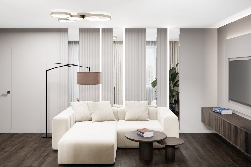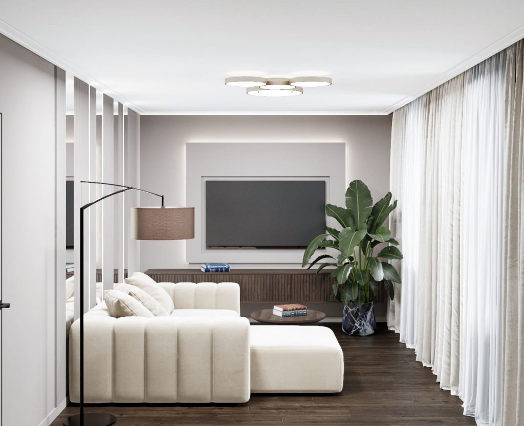 Белый модульный диван с мягкими вертикальными секциями стал центром композиции — удобный, уютный, без визуального шума. Напротив — ниша с ТВ и консолью из тёмного шпона, подчёркнутая мягкой подсветкой.